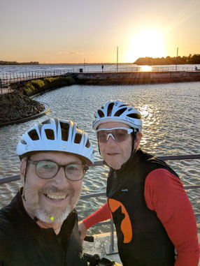 Von Sonnenaufgang bis Sonnenuntergang waren Gerald und Bernd auf dem Ochsenweg unterwegs. Unser neues Gravel-Abenteuer über 250 km ist echt zu empfehlen, auch wenn der Nordteil deutlich interessanter ist, ist es insgesamt ein spannender Ride. Mit Meik sind wir um kurz vor 7 in Flensburg gestartet, zunächst an der Förde entlang über die Grenze, damit wir den Ochsenweg bei km Null aufnehmen. Vorbei geht es an vielen historischen Stätten, über Tiefsand, Heidewege und zunächst wenig Straßen bis nach Rendsburg. Südlich des Kanals wird der Gravelanteil geringer, in Nortorf haben wir die Hälfte erreicht, es gibt Pizza in der Innenstadt, die Chefin kommt uns besuchen, Meik steigt wie verabredet aus. Weiter geht es, eine Kaffeepause gibt es in Barmstedt und um kurz vor 20 Uhr erreichen wir zum Sonnenuntergang die Elbe in Wedel. Noch ein Eis und pünktlich die S-Bahn zum Hbf genommen und zum Zug nach Hause. Denkste, ab Neumünster Schienenersatzverkehr, aber wozu haben wir Räder mit. Am Bahnübergang Timmaspe wussten wir dann, warum der Zug nicht fahren konnte. Bauarbeiten am Bahnübergang, also wieder zurück und über Heinrichshof nach Timmaspe, um kurz vor Mitternacht dann wieder zu Hause. Auch Bock auf so ein Abenteuer? HIER findest du alles dazu.
